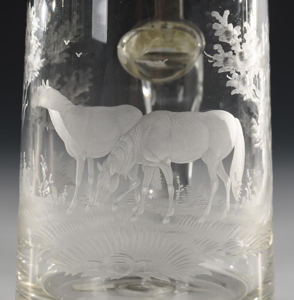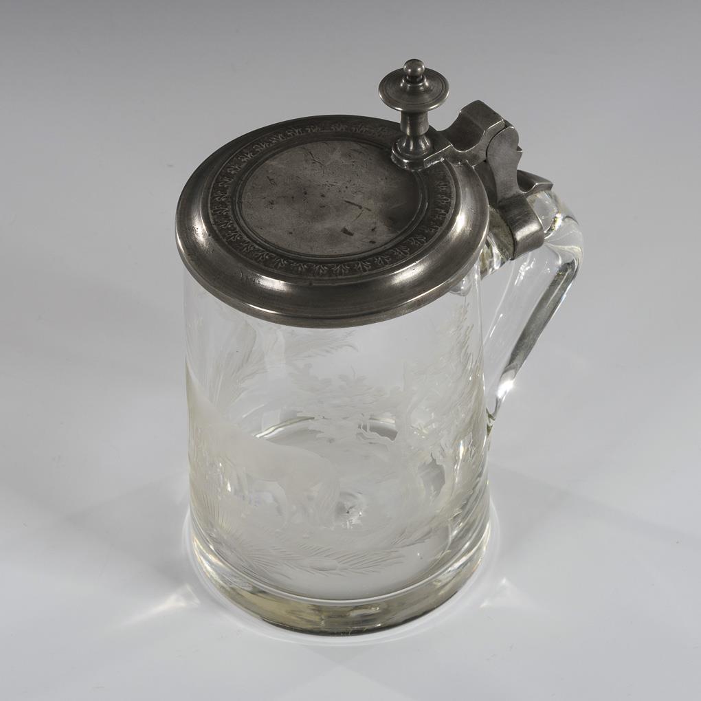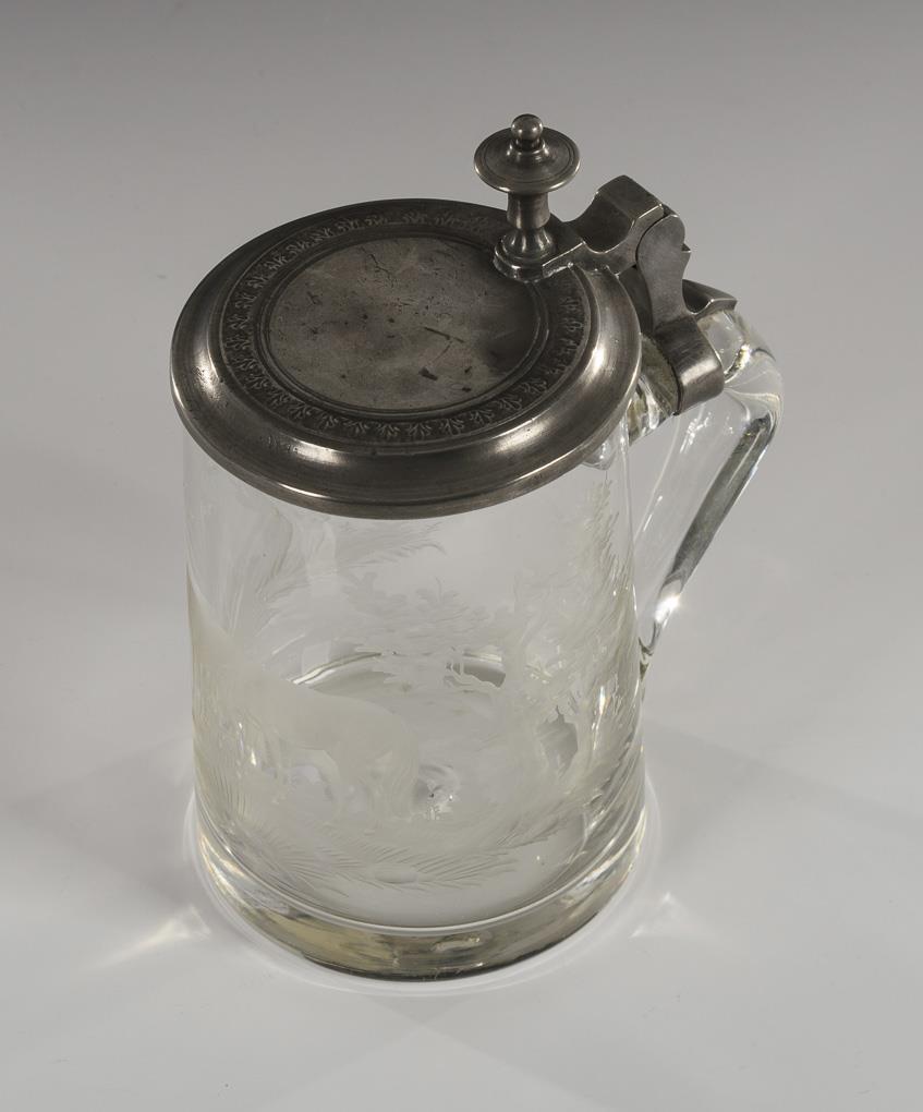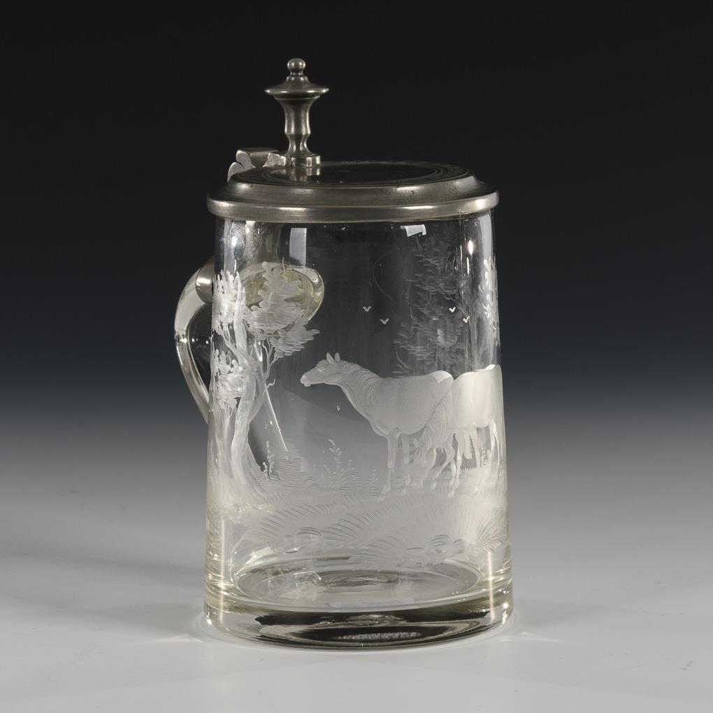 Slightly conical jug with pewter mounted hinged lid. On the front the engraved representation of a landscape island with two horses.