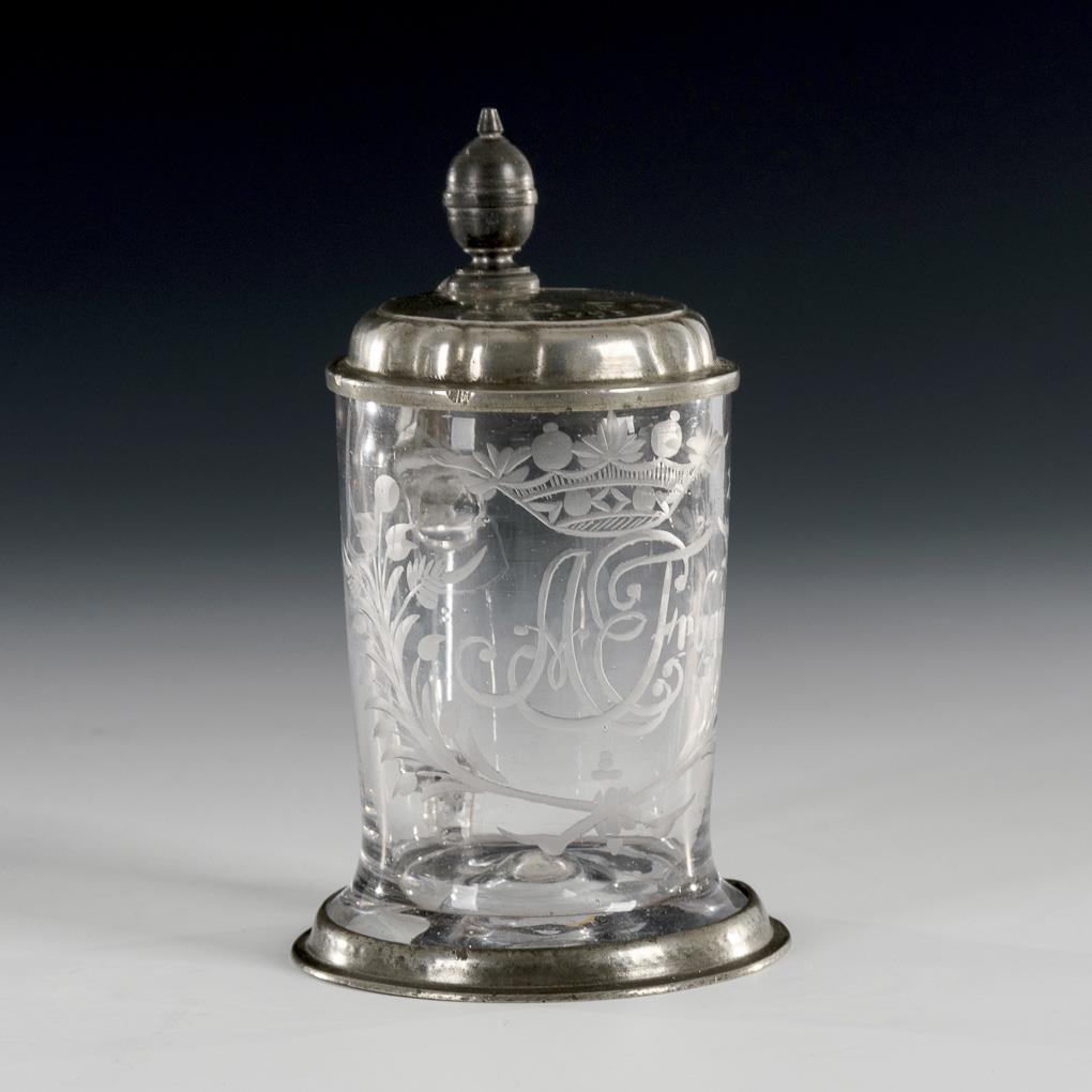 You are here:   Home Categories Glass Kleiner Deckelhumpen graviert mit Zinndeckel und -fuß