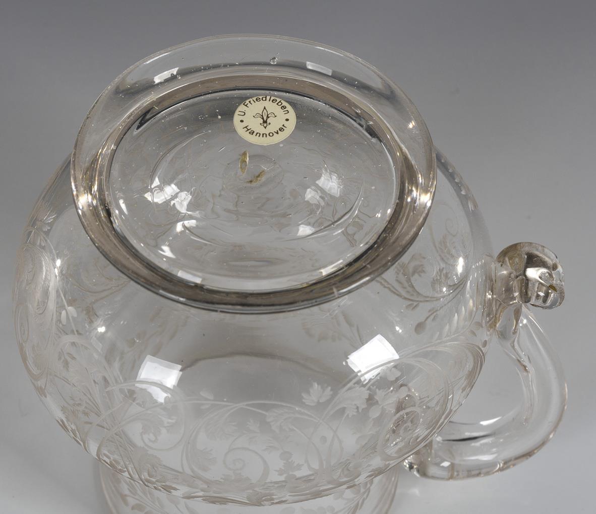 Bellied jug with ear handle. Richly engraved with floral-ornamental vine work.
