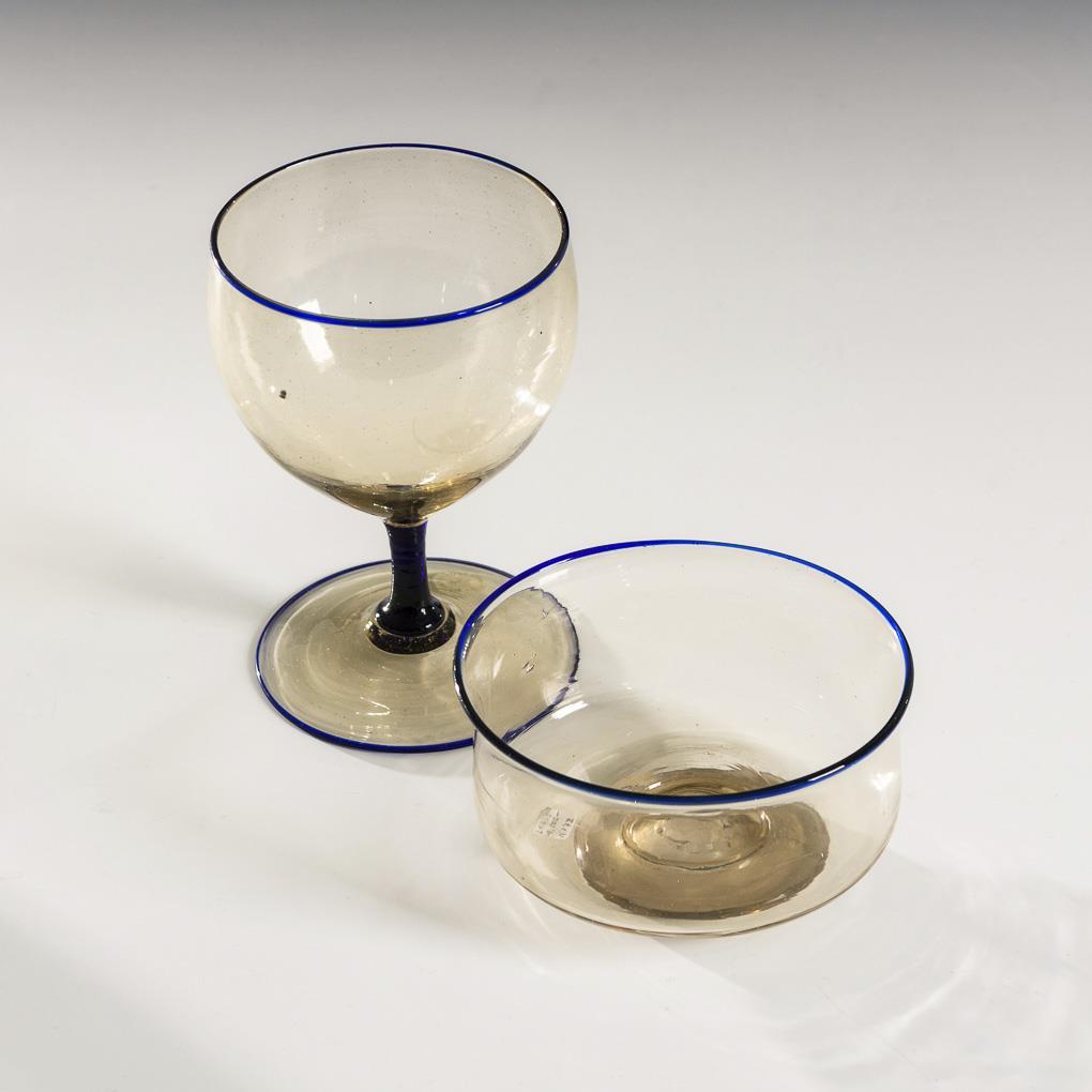 2x Venice, late 19th c.: wine glass (h 12,5 cm) and bowl with small foot (h 5,5 cm). / 1x longitudinally optically shaped blown jug (h 16 cm). Stress cracks at the lower handle base of the jug.