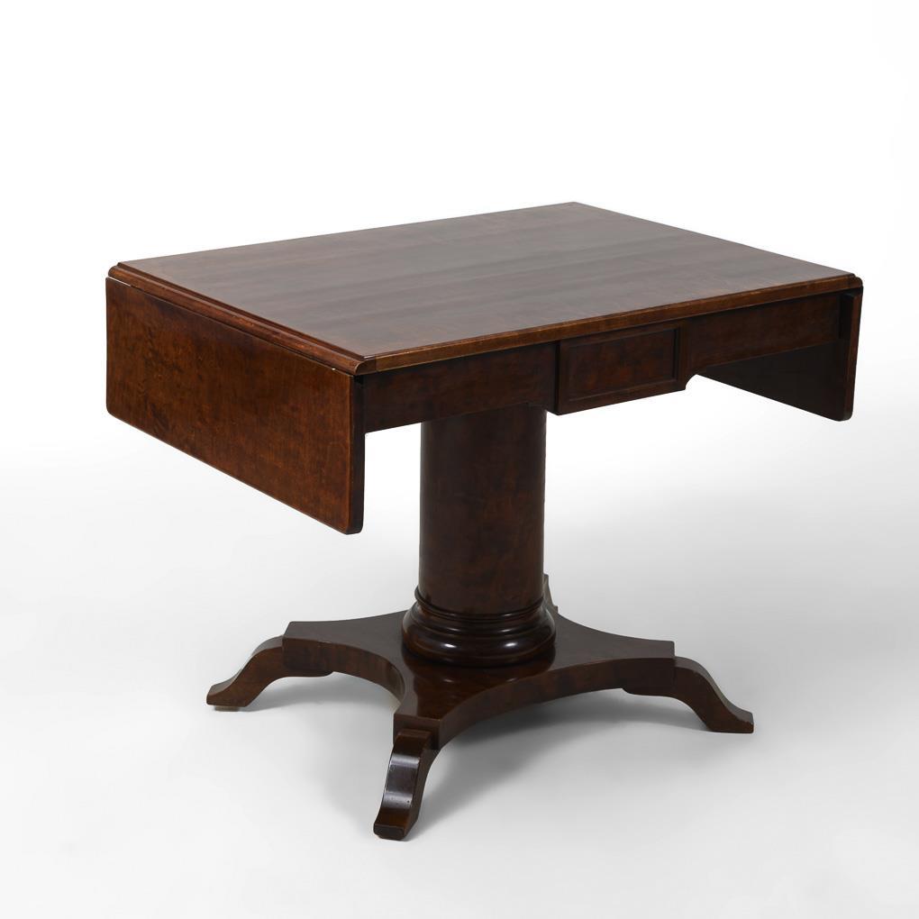 Side-wall table on column center support with concave indented footplate and 4 curved feet. Slight signs of age/use, veneer with small defects.