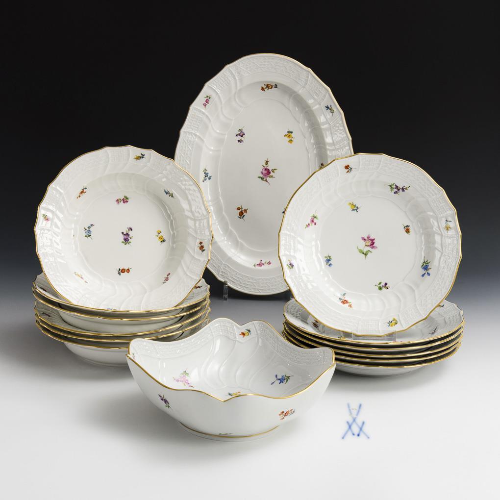 14 pieces of a dinner service with scattered floral painting. Meissen.