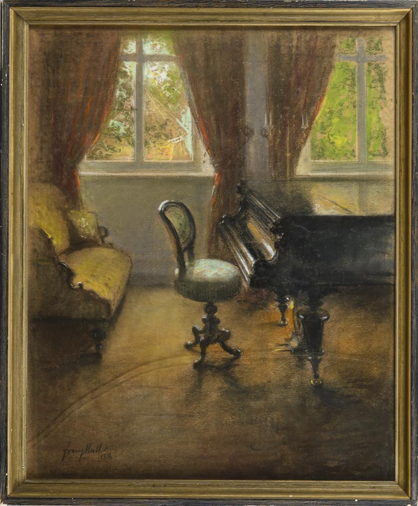 Interior with grand piano and sofa in front of the windows. Stick stained.