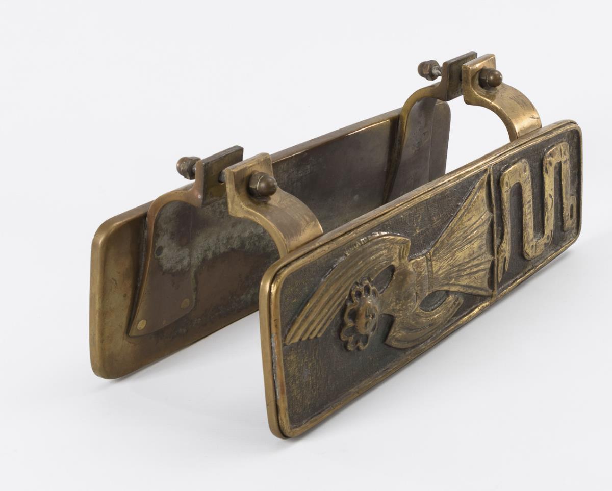Brass plate chased and punched, solid brass mounts with cap nuts and screw connection. Fingerboard 40 x 11 cm. Together 4.3 kg.