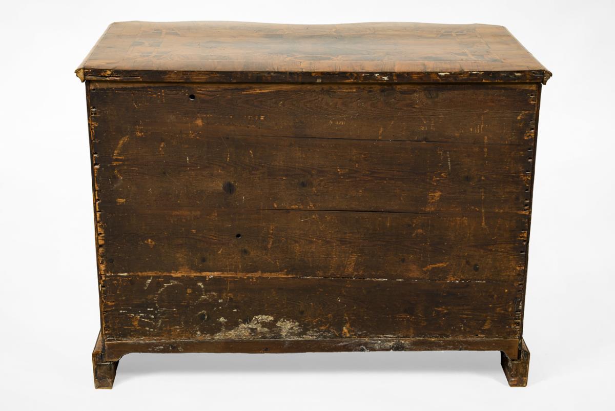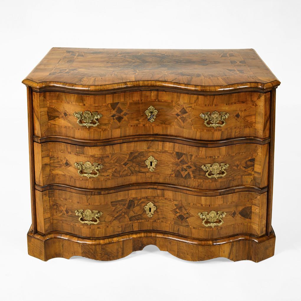 3-bay chest of drawers with curved body, on curved plinth frame, decorated with mirrored burl veneer and ribbonwork marquetry, decorated with swan-neck brass handles and grotesque fittings. Traces of age/use, restored with additions.