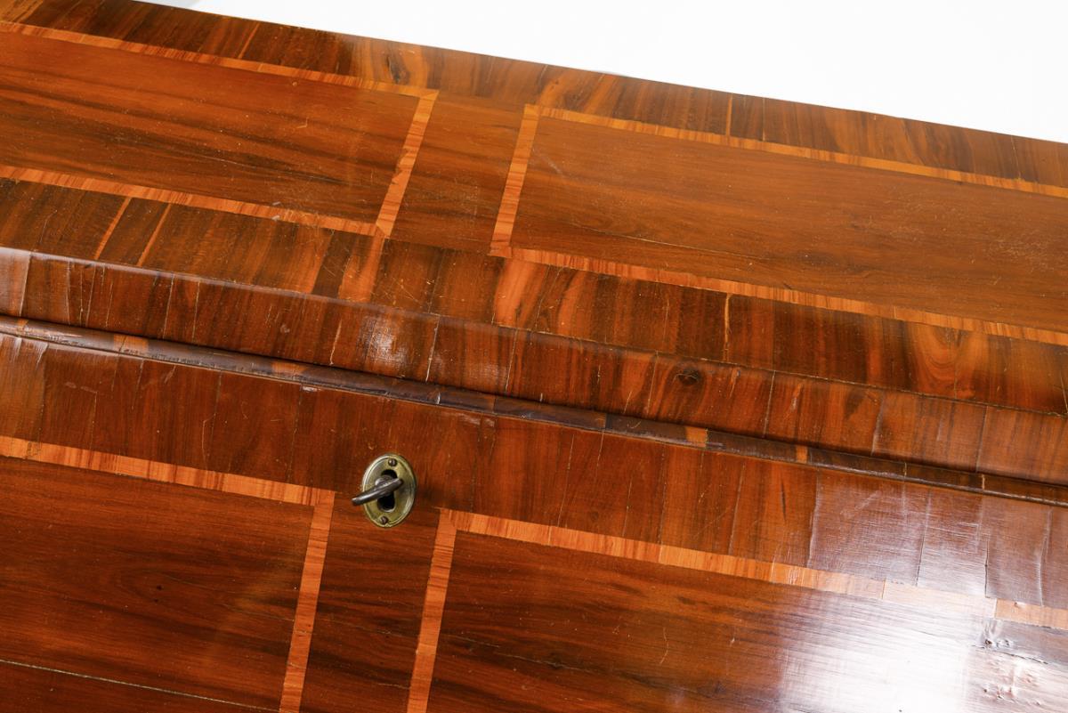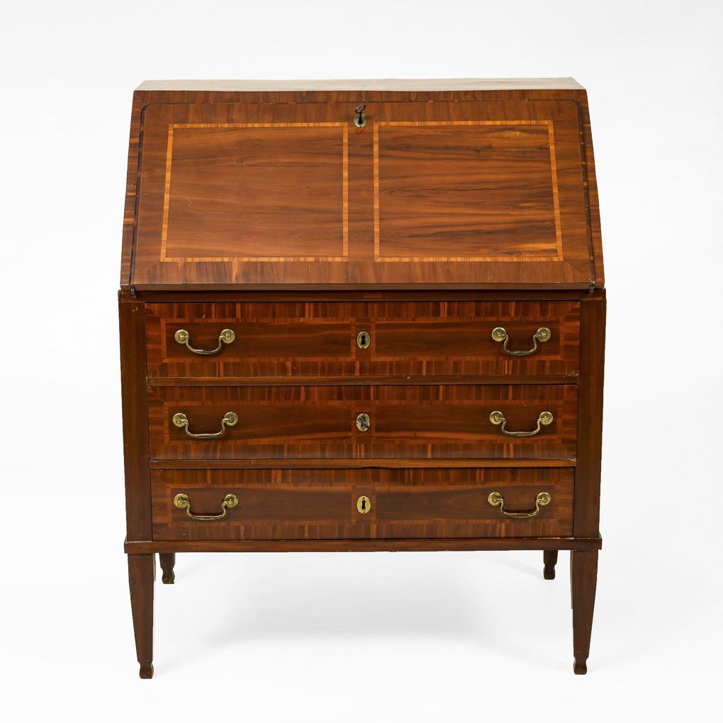 Simple writing cabinet in classicist style with 3-bowl corpus and sloping writing flap; decorated with coffered burl veneer and plain bow handles; inside with 4 small drawers and 3 open compartments. Marks of age/use, small veneer defects, restored, 1 lock missing.