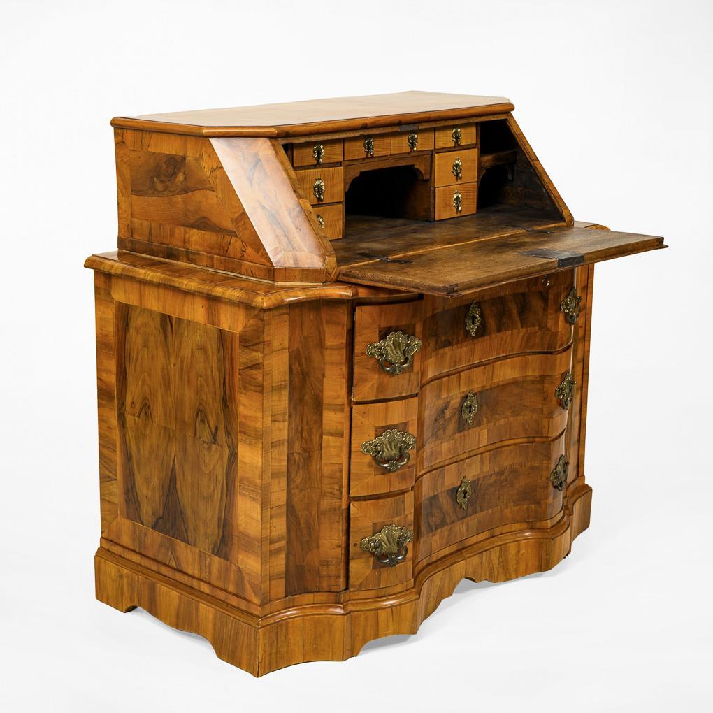 Writing cabinet with 3-bay curved body and top with sloping writing flap; decorated with mirrored burl veneer and lush bronze applications; inside cabinet fittings with 8 small drawers and 5 open compartments. Signs of age/use, restored with additions.