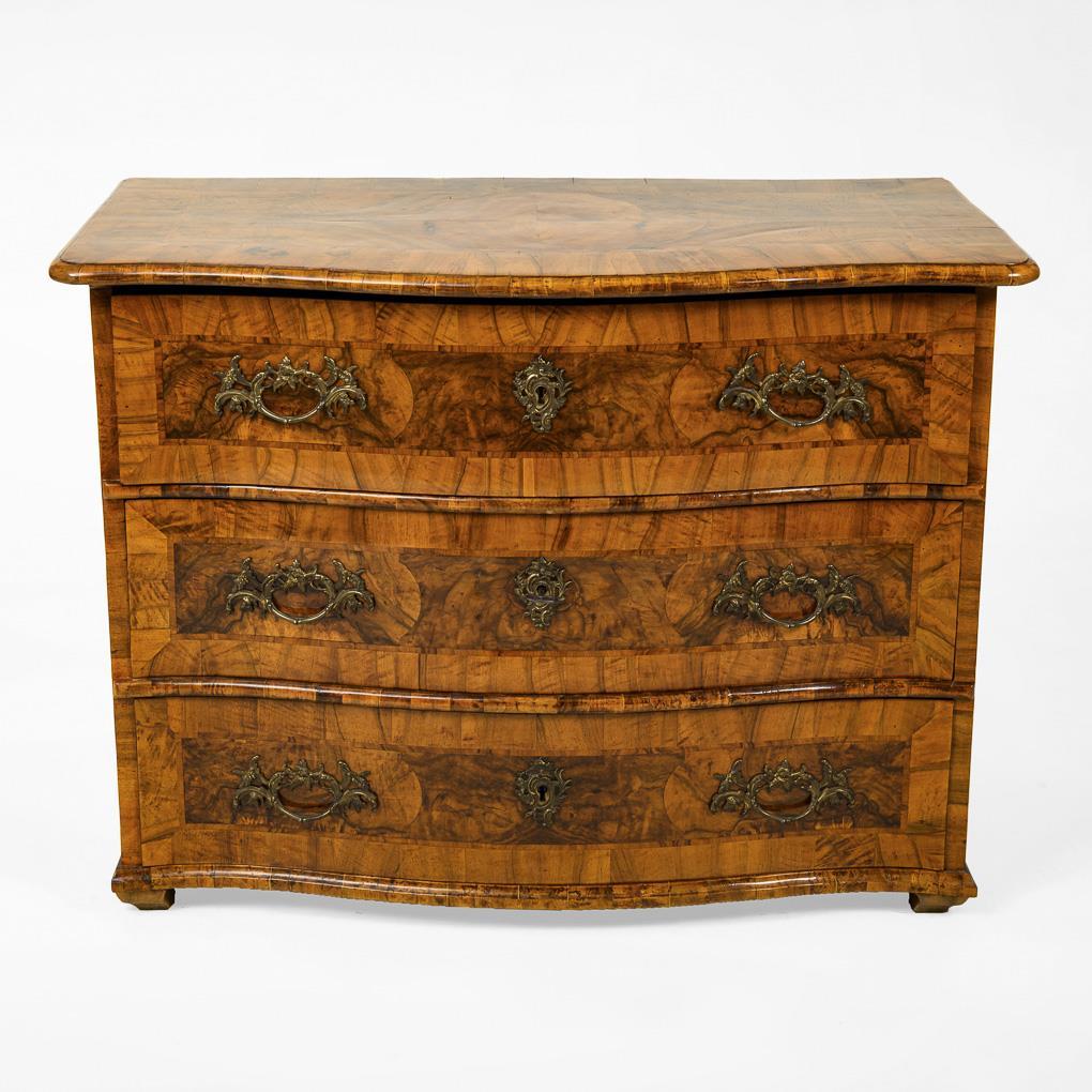 3-bay chest of drawers with slightly curved body, decorated with mirrored burl veneer and rocaille bronze fittings. Restored ready for living.
