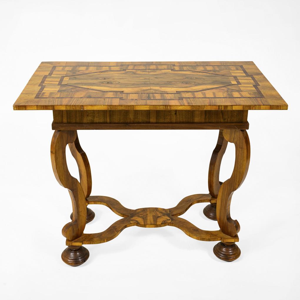 Rectangular table on 4 curved legs with curved foot bracing and flattened ball feet, decorated with mirrored burl veneer and ribbon marquetry; 1 hidden frame drawer. Signs of age/use, restored with additions.