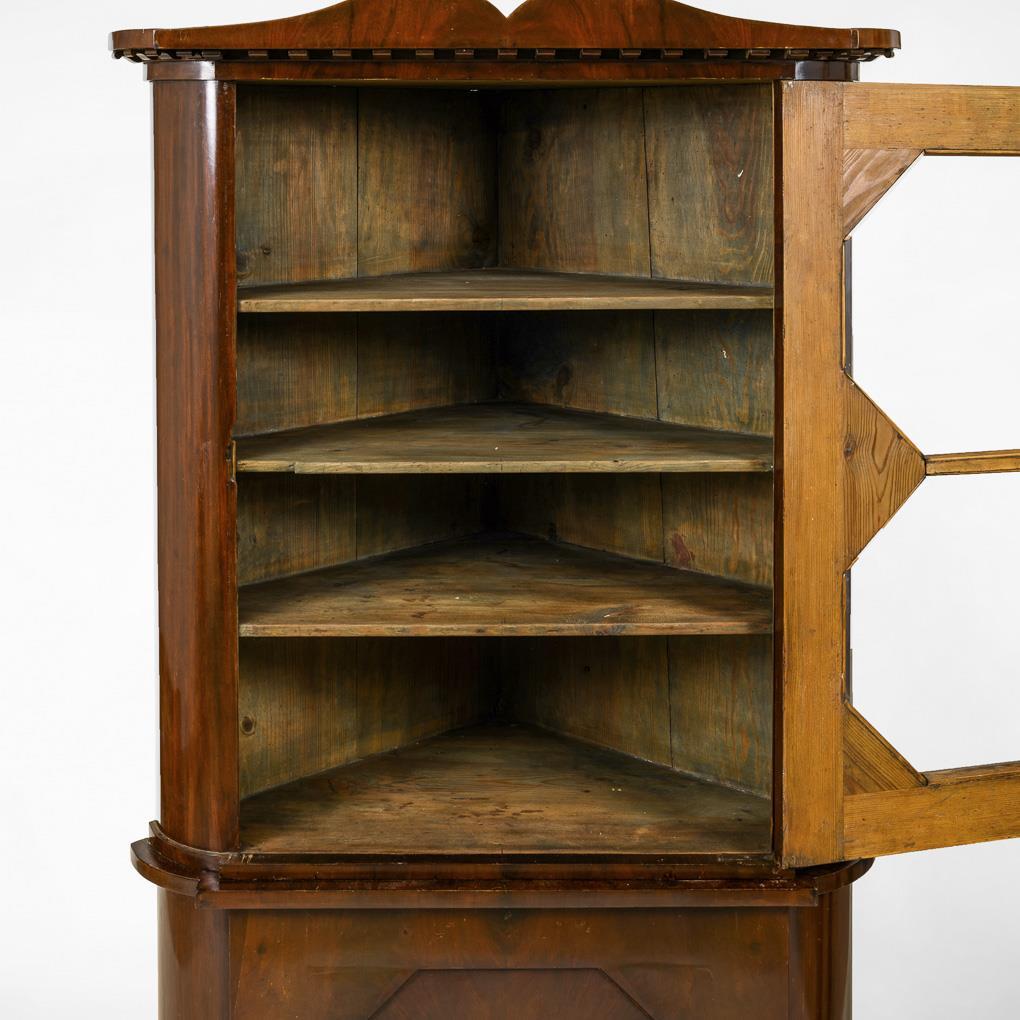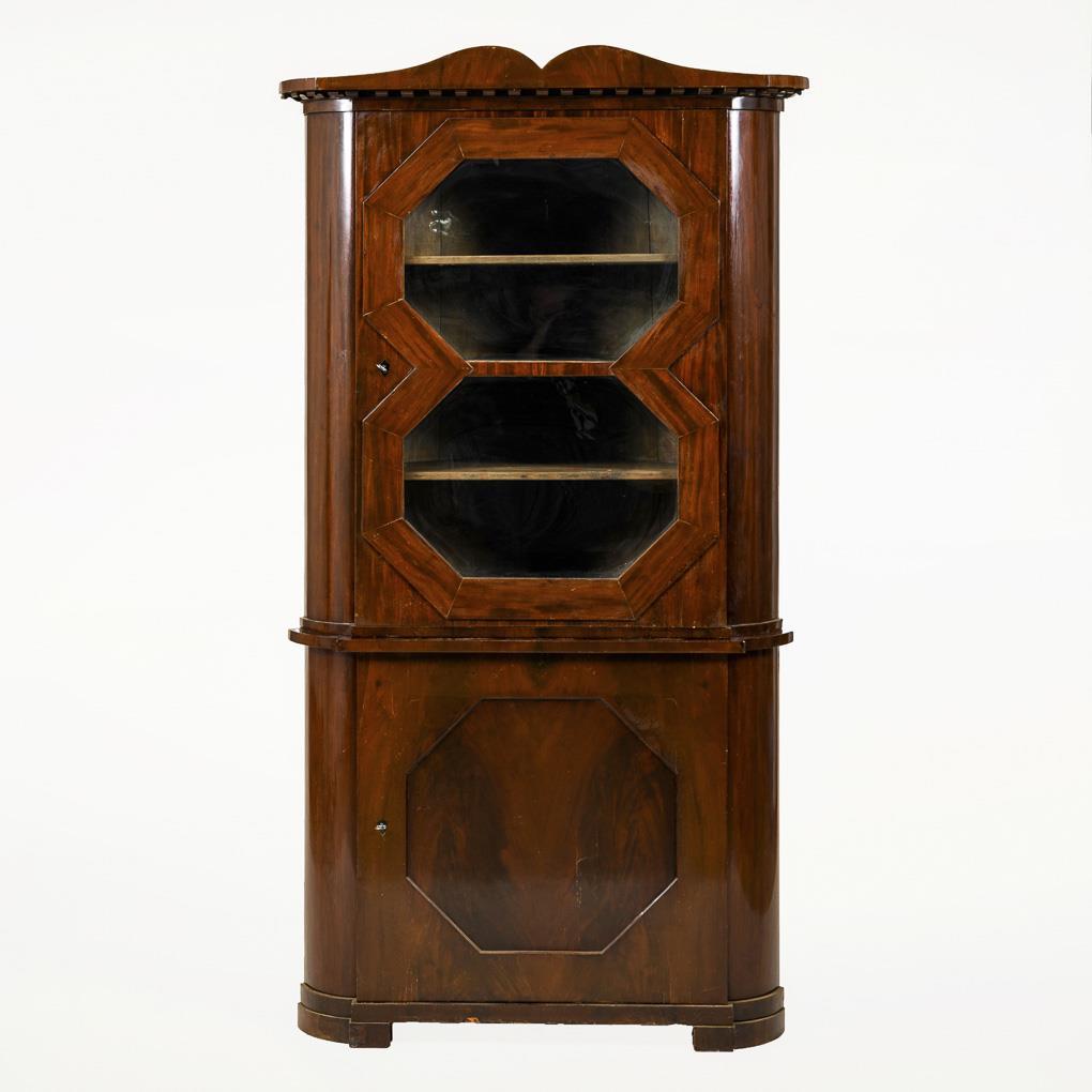 2-piece body with 1-door base cabinet and display case top with polygonally designed glass front, decorated with segmented pediment with dentil frieze and bulging side roundings; top with 3 shelves, base cabinet with 1 shelf. Restored, signs of age / use.