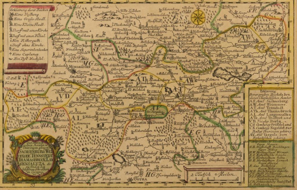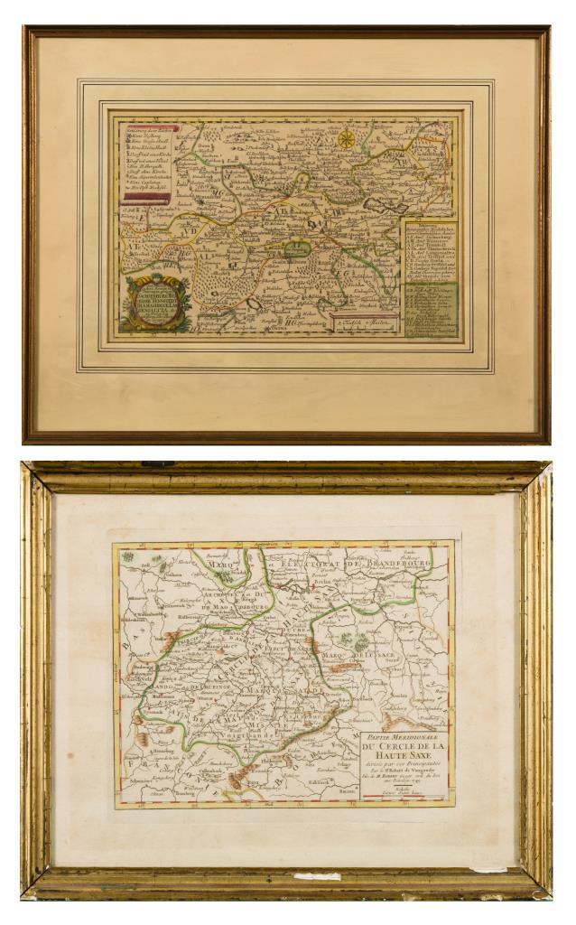 Grenzkolorierter Kupferstich, Platte 17,5 x 21 cm, verglast und gerahmt 26 x 31,5 cm, bezeichnet "Partie Meridionale du Cercle de la haute Saxe divisée par ses Principautés [...]/ Par le Sr. Robert de Vaugondy [...] 1749". Jüngerer Nachdruck eines Kupferstiches mit Kartuschen, Ansicht 16 x 25 cm, verglast und gerahmt 31 x 38,7 cm, bezeichnet "Die Chursächsischen Ämter in Thüringen gelegen. Sachsenburg, Weisensee, Tennstedt, Thamasbruck, Langensalza etc: zu finden bey Joh. George Schreibern in Leipzig" . Etwas stockfleckig.