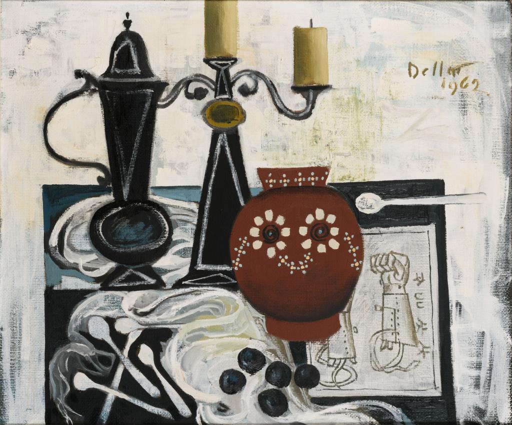 Keramikvase neben Kerzenleuchter und Kanne sowie Zeichnung mit Armprothesen auf einem Tisch.