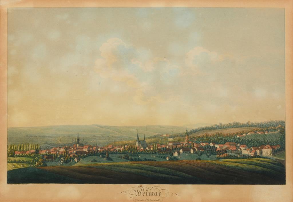 Ansicht der Stadt "Weimar von der Südwestseite", "nach der Natur gezeichnet von Ed. Lobe". Stockfleckig.