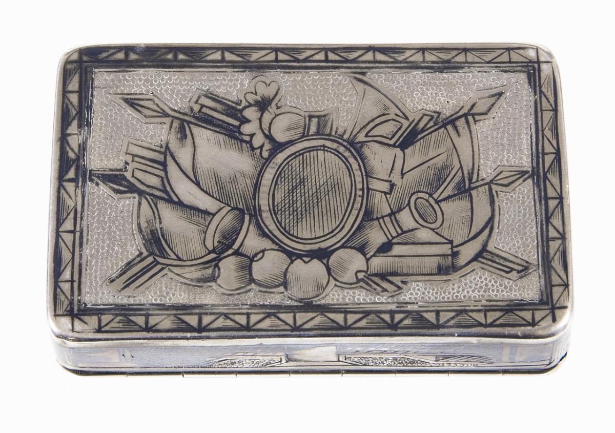 Silver, niello decoration on all sides, gilt interior. Lid inscribed in Cyrillic Peter I (Peter the Great, 1672-1725) and Catherine II (Catherine the Great, 1729-1796), bottom with trophies. Body with flush hinged lid, narrow thumb handle. Indistinct hallmarks.
