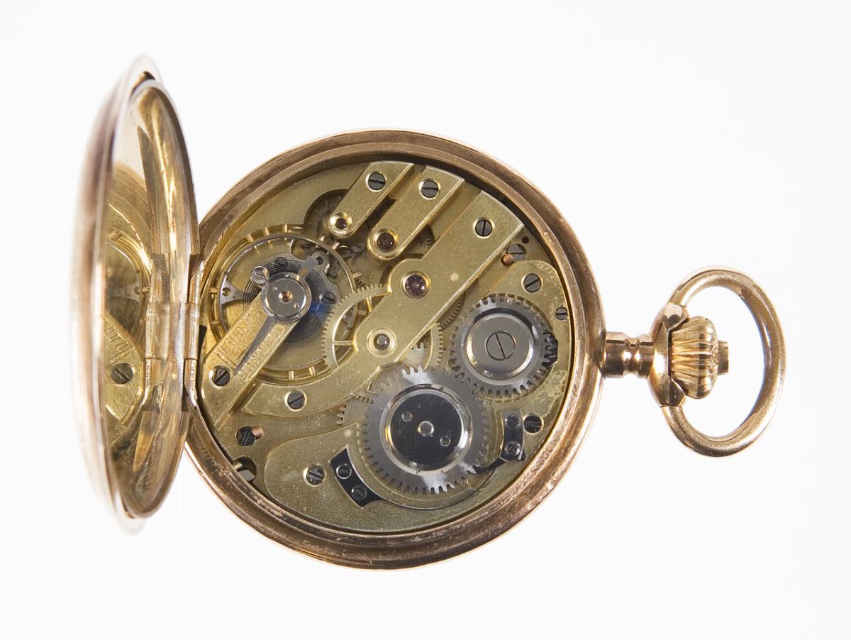 Case with floral decoration covering both sides. Metal inner lid, gilded bridge anchor movement, Breguet hairspring, 15 rubis. White enamel dial, black Roman and Arabic numerals, small seconds. Crown winding. Lift defective.