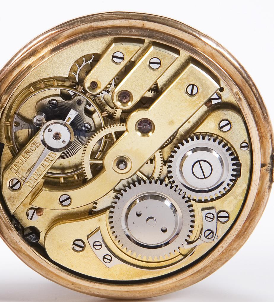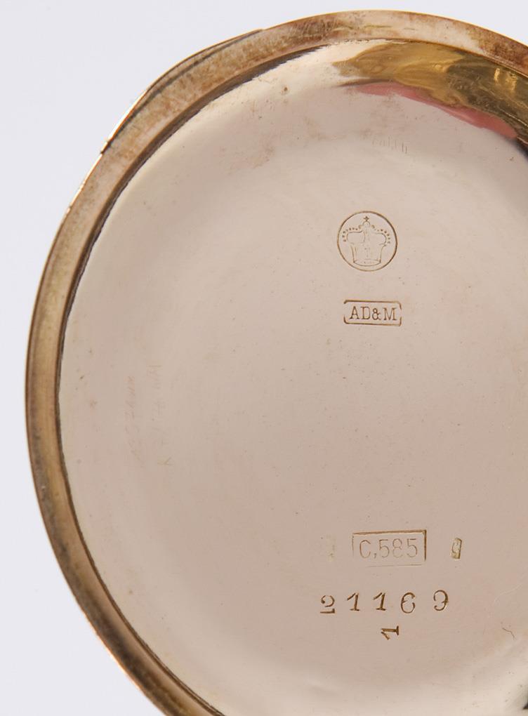 Case with floral decoration covering both sides. Metal inner lid, gilded bridge anchor movement, Breguet hairspring, 15 rubis. White enamel dial, black Roman and Arabic numerals, small seconds. Crown winding. Lift defective.