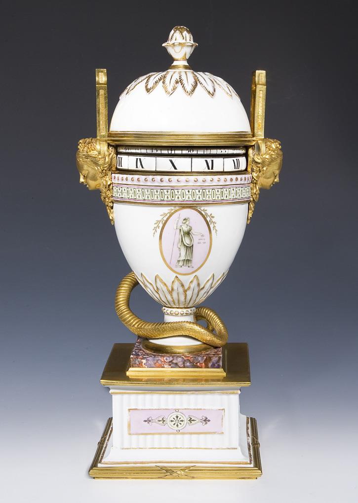 Mount by Boin Taburet à Paris, bronze, brass, gilt. Porcelain with sepia painting, partially relief, rose and gold painted. Oval reserves on both sides with mythological goddesses of youth and justice, marbled plinth. Horizontal hour dial ring, minute dial ring above, white enamel plaques with black Roman and Arabic numerals. The tongue of the snake acts as a hand. Anchor escapement, lock disc striking movement. Bottom mark. Movement functional in the short-term test. Striking mechanism defective.