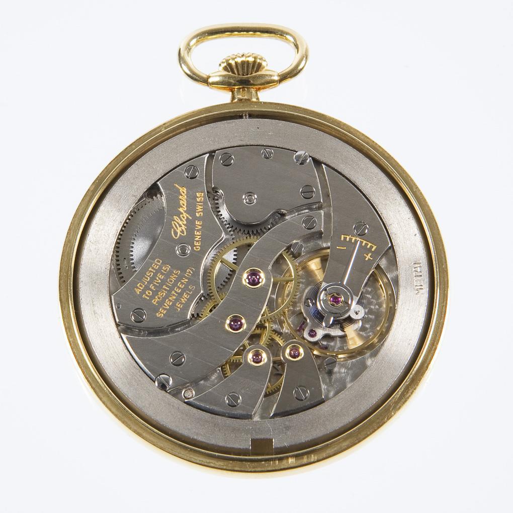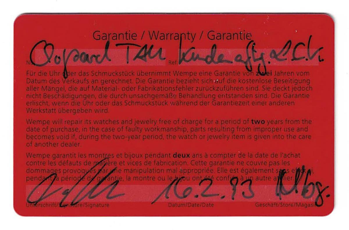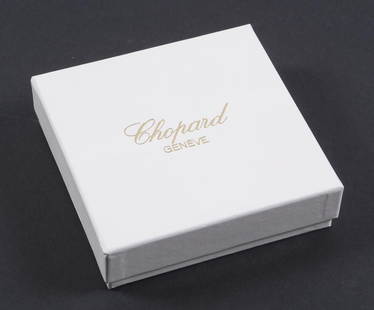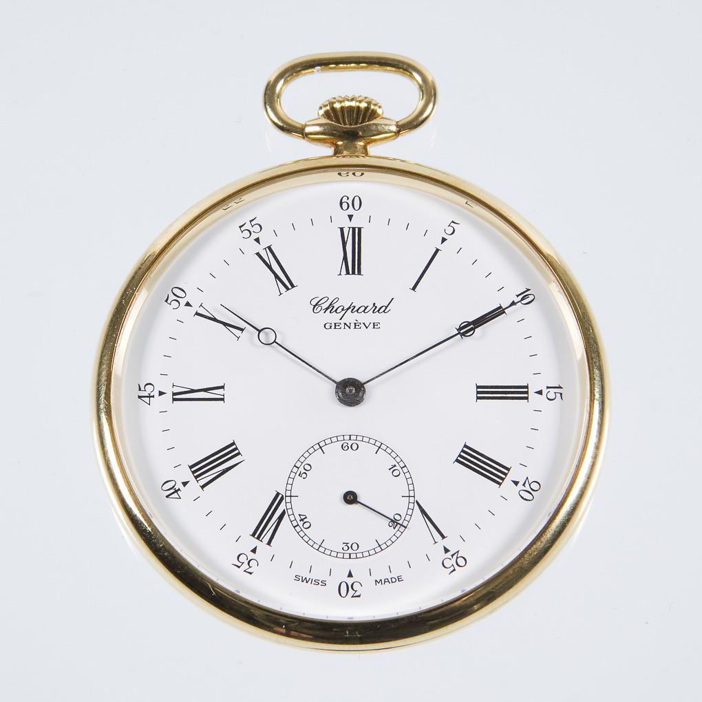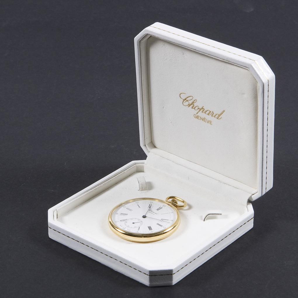 Crown winding. Anchor movement with Geneva stripes. 17 jewels. White dial, black Roman and Arabic numerals, graceful hands, small seconds. Warranty card, Chopard case, box. Functioning in short time test.