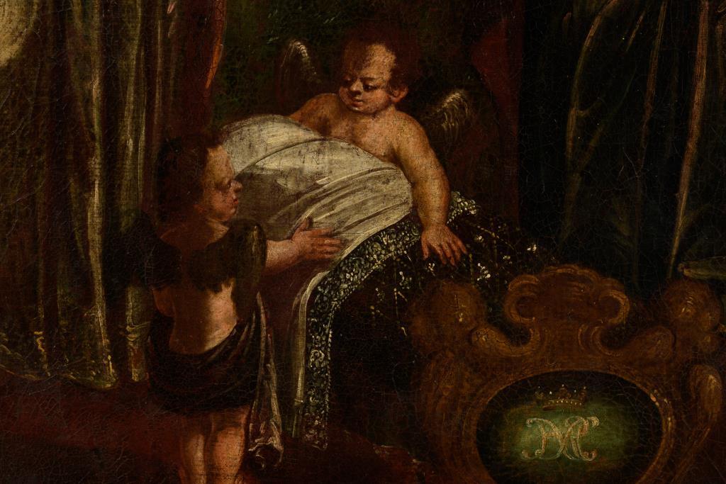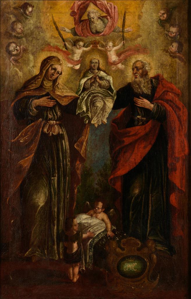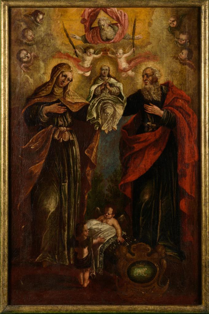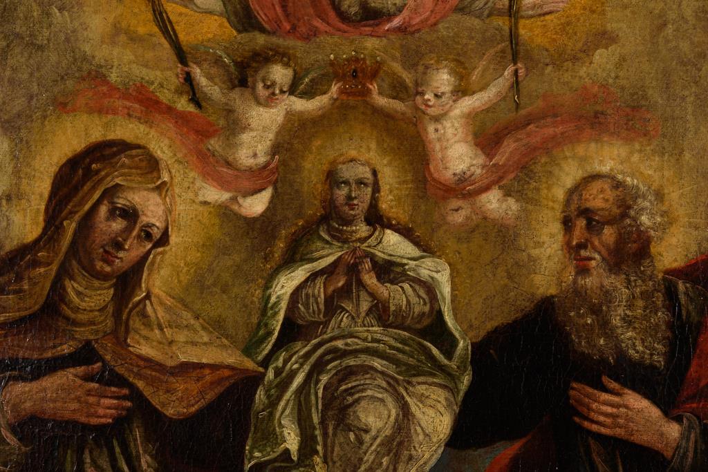 Krönungsszene mit Heiligen, Gottvater und Putten. Leinwand doubliert.