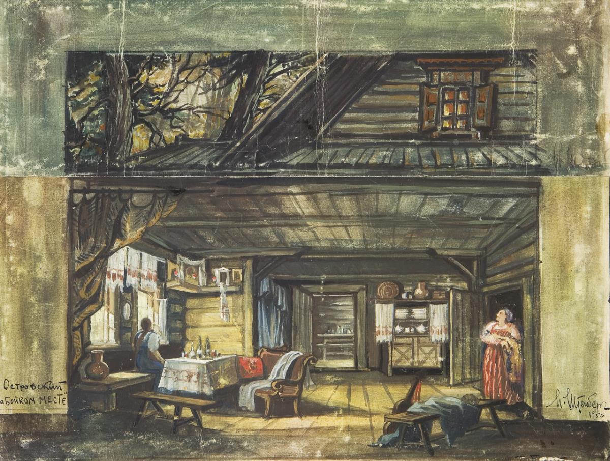 Scene from the comedy "Thieves and Love" (also: A Visited Place) by Alexander Nikolaevich Ostrovsky 1865. Inscribed. Without frame. Two-part, the upper part mounted, adhesive residues on the back, partial creases.