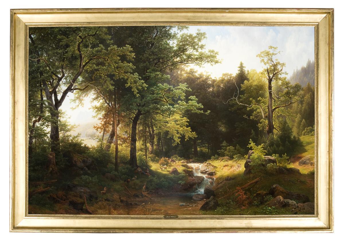 View with a detailed observation of nature. Close-up and distant views are effectively combined, emphasizing the depth of the subject. Inscribed on a frame plaque. Original stretcher, original profiled gold frame.