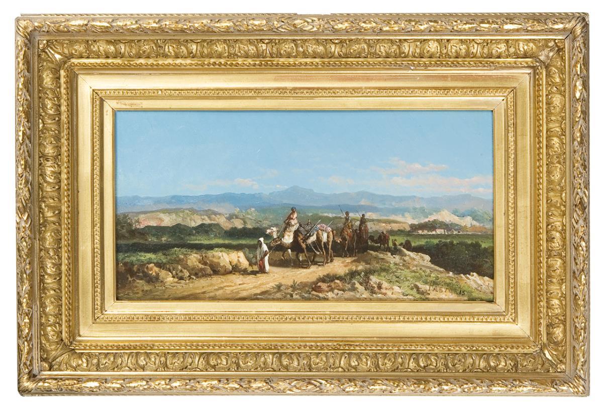 Vast landscape with the picturesque charms of the Orient in concise, but softly differentiated color. Inscribed: Pastor(is), heavy gilt stucco frame.