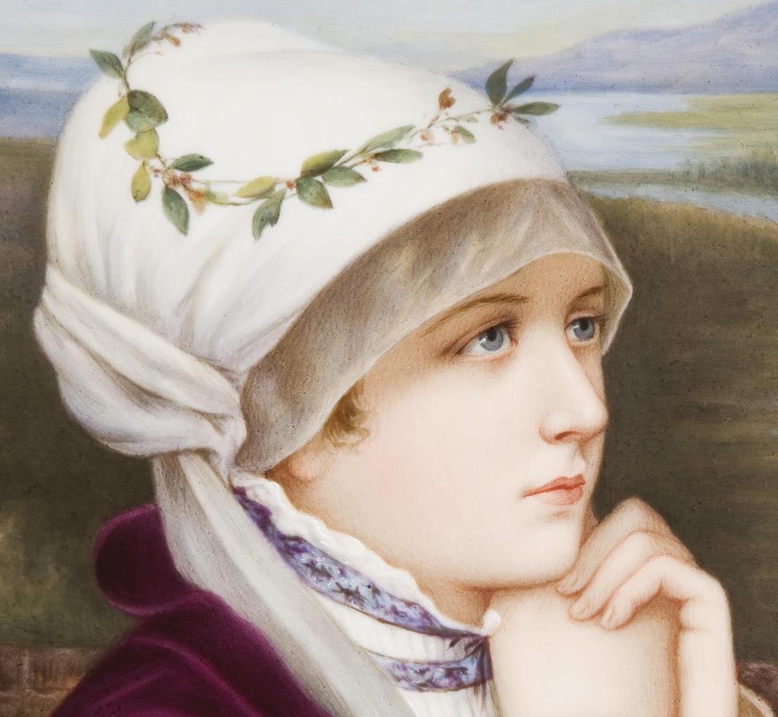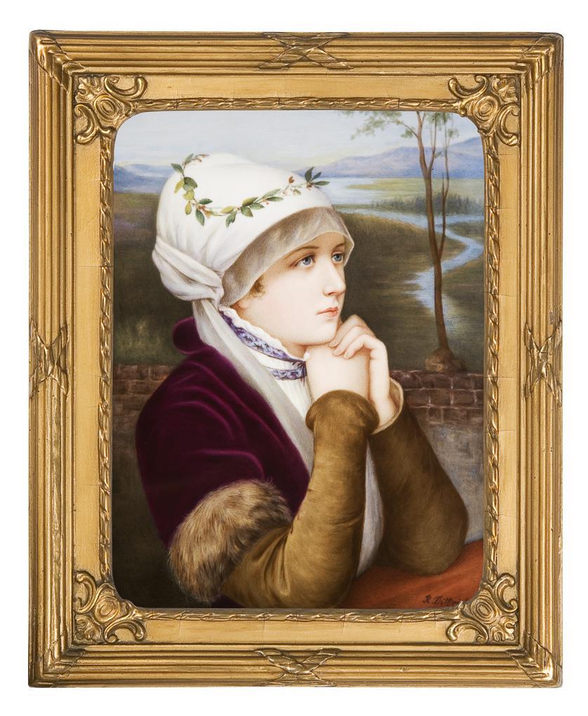 After the painting template by Friedrich August von Kaulbach (1850 Munich - 1920 Ohlstadt). Fine colored painting by Rudolf Dittrich (porcelain painter in Dresden, registered in 1894), signed. Unglazed bottom, press marks. Original gold frame.