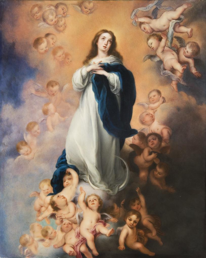 Fine colored painting after the painting template of Bartolomé Esteban Murillo (1618 Seville - 1682 Seville). The painting (274 x 190 cm) hangs in the Museo Nacional del Prado in Madrid. It was commissioned by Justin de Neve (1625-1685, Seville). Unglazed base, pressed mark. Elaborate gilt stucco frame with wooden back. Dutch adhesive label on the reverse. Punctual glaze irregularities.