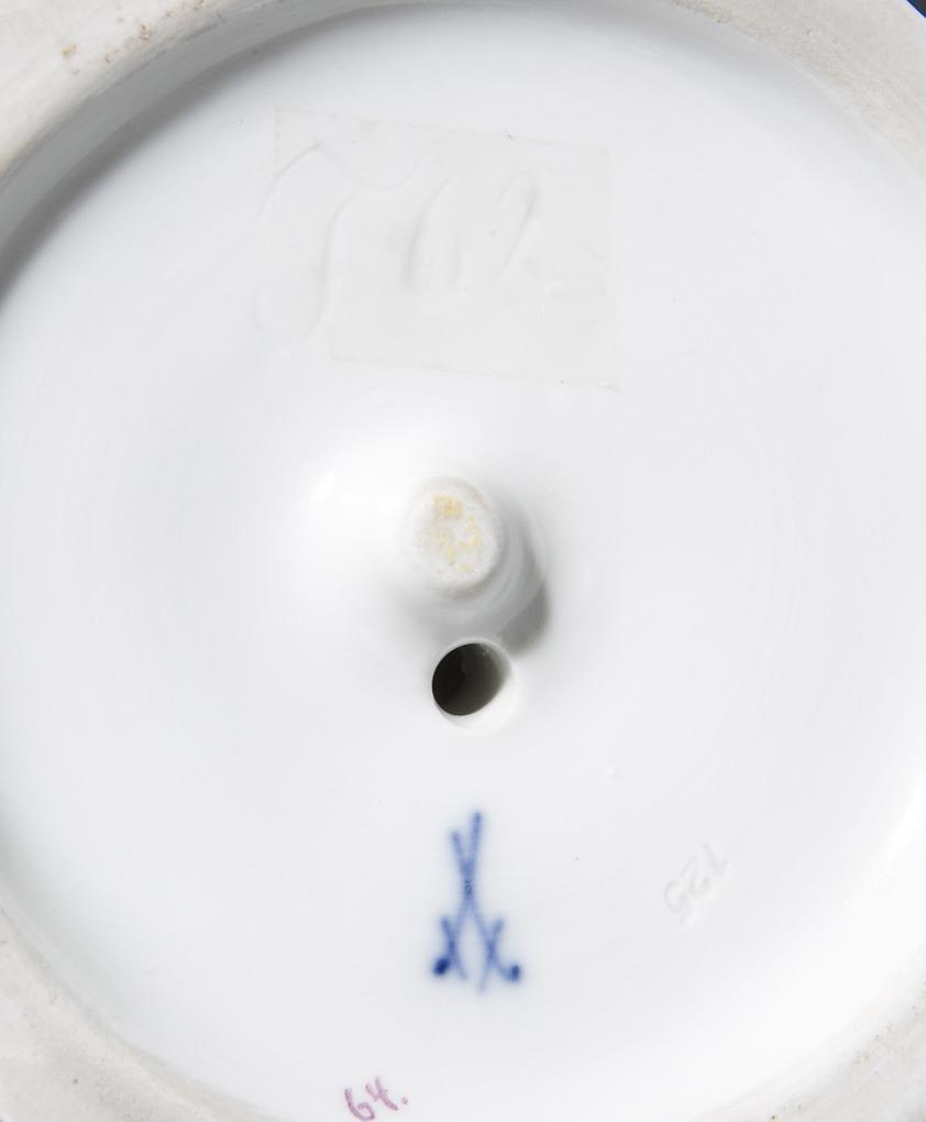 Model by Jakob Ungerer 1902-1904. colored painted, gold painted. Incised mark, press mark, painter's mark, sword mark. One upper arm at a break, dog restored.
