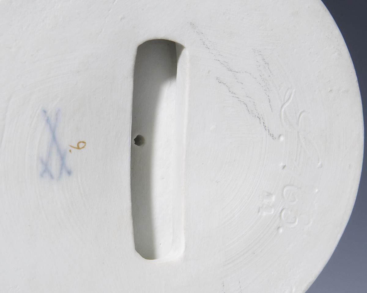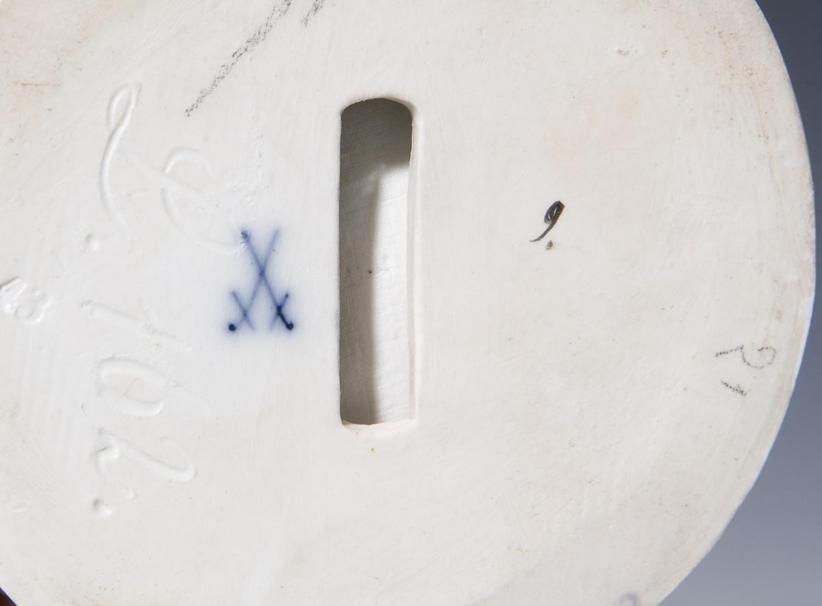 Model by Jakob Ungerer 1881. Colorfully painted, gold painted, lace trim (original fabric lace is dipped in the glaze, which burns up during firing). Unglazed base, incised marks, press marks, painter's marks, sword marks. Lace trim partially bumped, one finger restored.