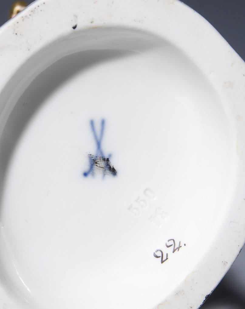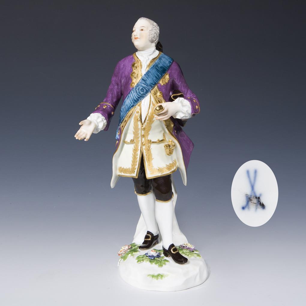 Model by Johann Joachim Kaendler 1744. single figure from the love group cavalier and hoop skirt lady with the same model no. Colored painted, gold painted. Press marks, painter's mark, sword mark. One finger tip, breakage on the neck restored.