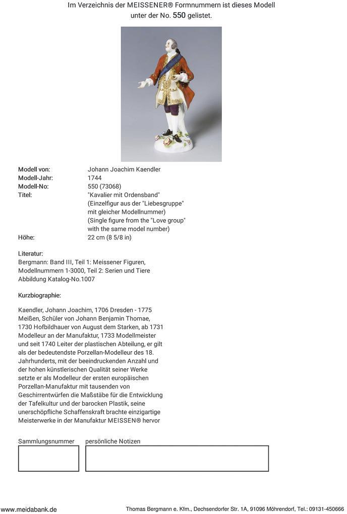 Kaendler 1744: "Ein neues Crouppgen gehöriger maßen zerschnitten und zum abformen Zu bereitet, Welches Vorstellet Wie ein Ordens Ritter mit dem Stern auf der Brust, eine wohl geputzte Dame bey der Hand führt" * Partnerauktion Bergmann.
