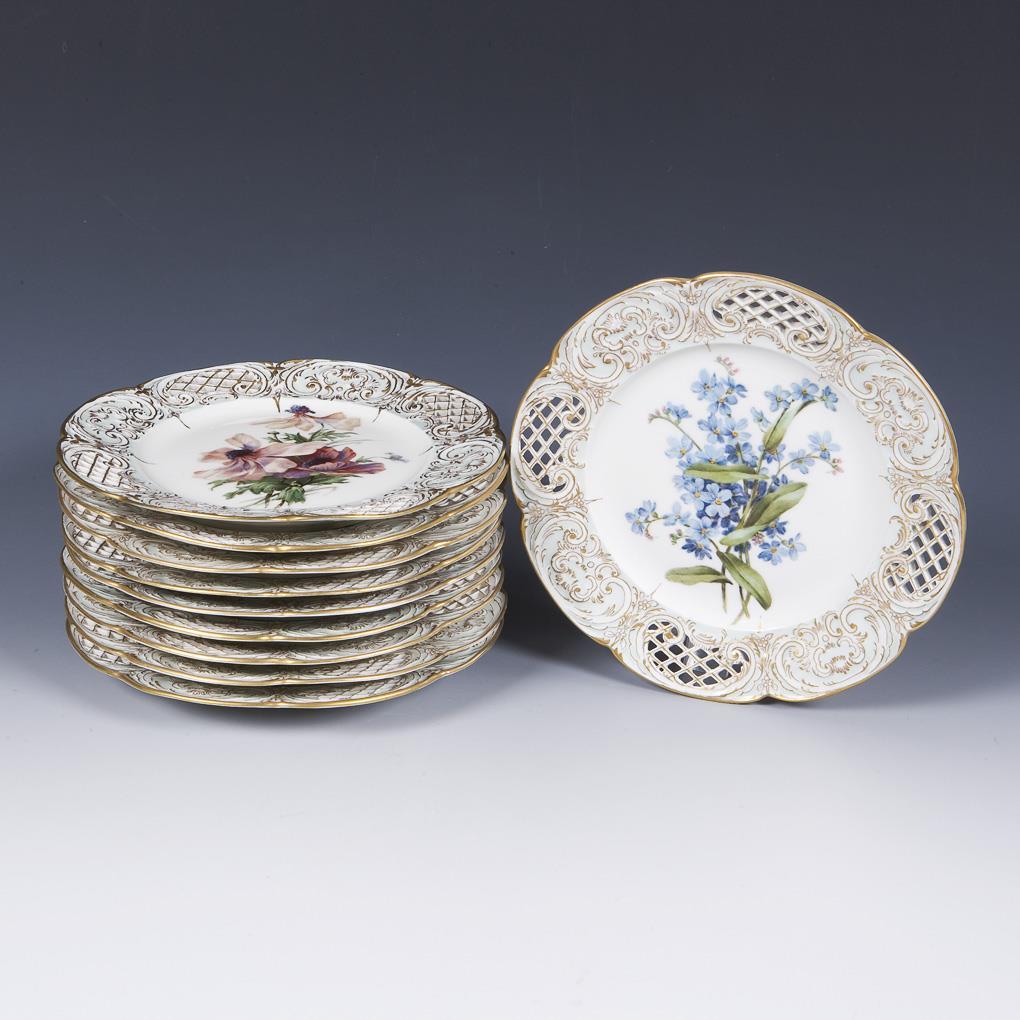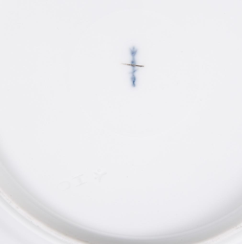 Rococo form, mold model of Julius Mantel 1872. Reliefed, gold staffiert, flag with pastel background, painted in color. In the mirror extensively painted ten different floral motifs. Press marks, blue scepter marks once painted, without painters marks.