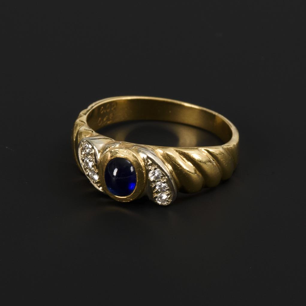 Sturdy bar with engraved dates. 1 sapphire cabochon 0.69 ct, 6 small diamonds 0.08 ct. Hallmarks: Fineness.