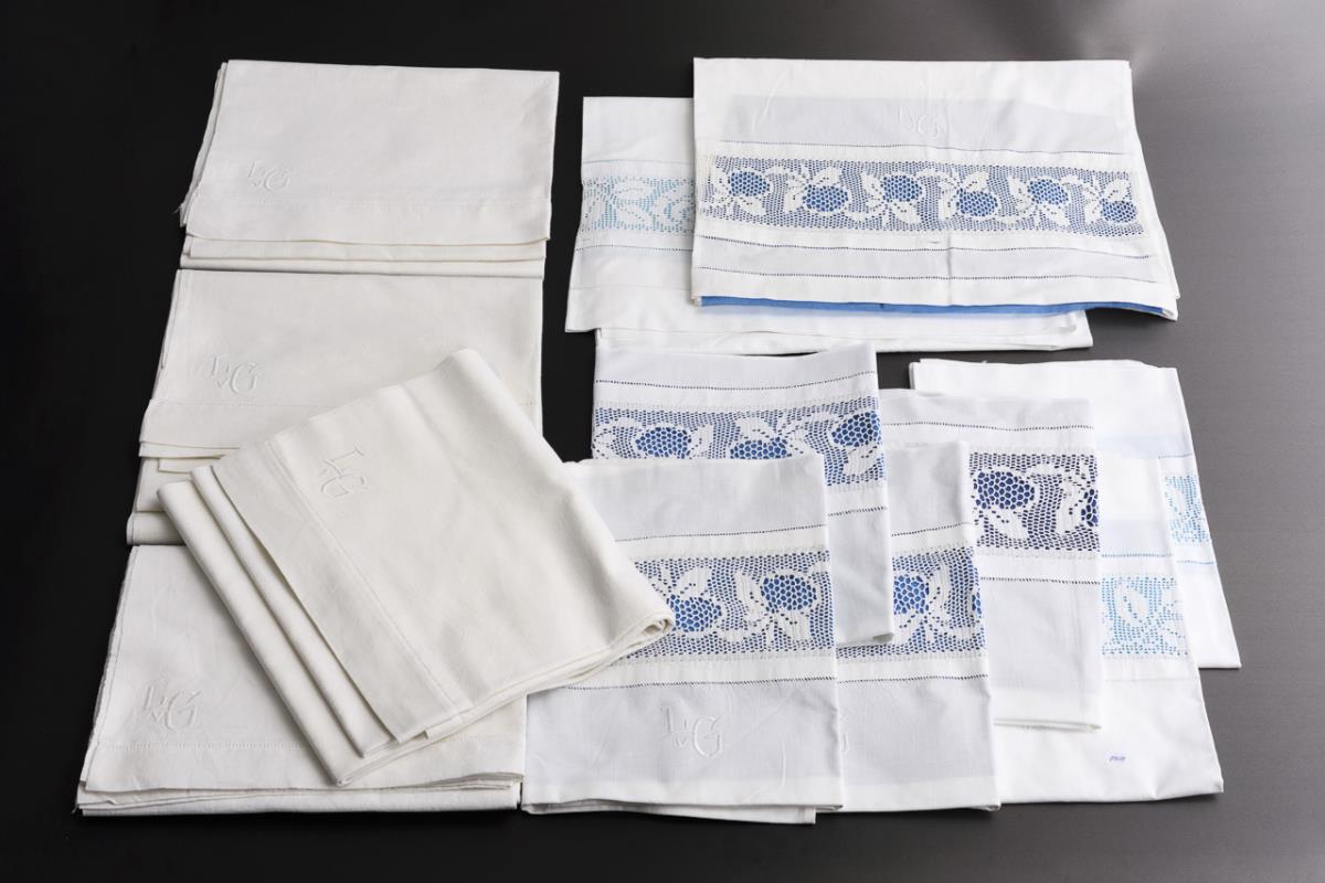 2 foldover sheets (235 x 148 cm) and 6 pillowcases (4 same + 2 same) with crochet inserts (75 x 74 cm), 4 sheets with hemstitching (1 sheet 212 x 144 cm, otherwise 220 x 132 cm). 1 pair of pillows with white monogram "vG", otherwise each with monogram "LvG".