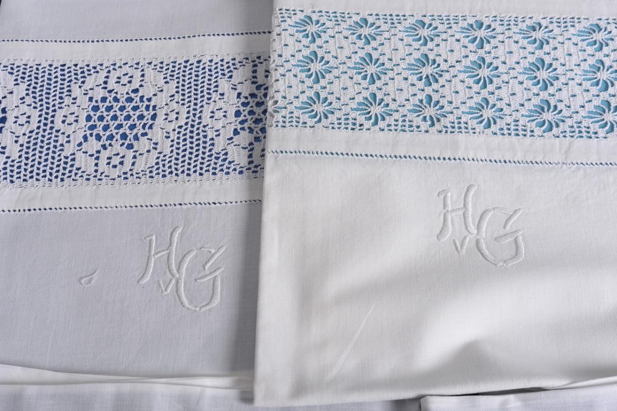 Handmade crochet inserts: Flowers and geometric patterns respectively, including 3 pairs. Each white noble monogram "HvG".