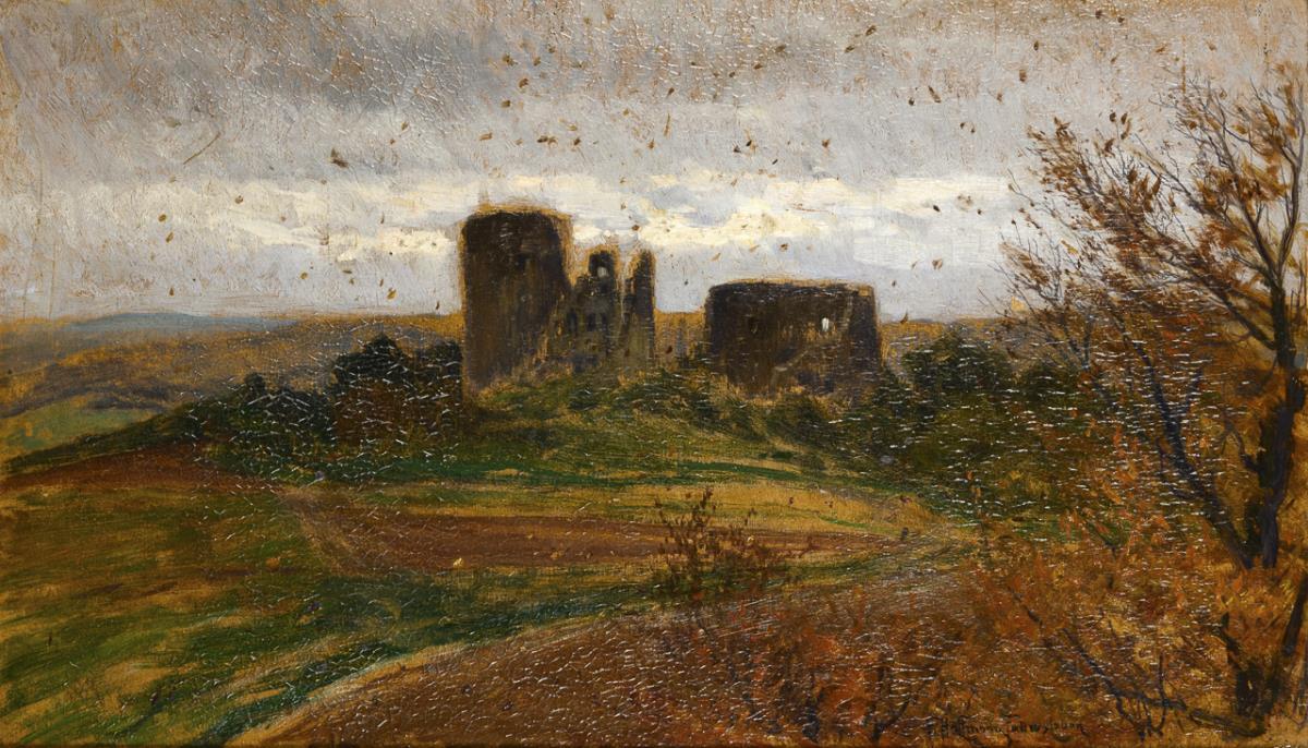 Castle walls in autumnal forest landscape under gray overcast sky. Traces of age.
