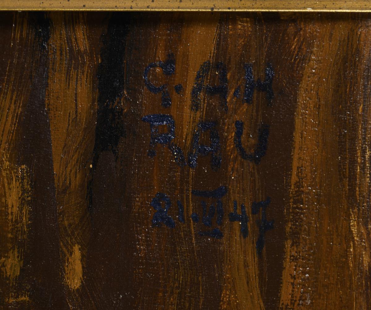 Oil/painted cardboard. Signed top right, verso winter image of the artist. 21. VI. (19)47.