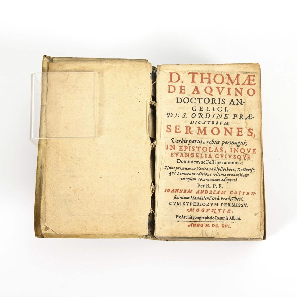 "Doctoris angelici de S. Ordinare praedictatorum, sermones, Verbis parvi, rebus permagni; In Epistolas, Inque Evangelia Cuiusque Dominicae, ac Festi per annum". Title, dedication, 442, (16), 6 blank pages. / "R. P. F. Joannis Andreae Coppenstein Mandalensis Ord. Praedicator. Theol. Dispositiones Concionum in totum annum, ad sensum literalem, & saepe mysticum: Ex D. Thomae De Aquino Commentariis In Matthaeum Et Joann. Et Ex S. Bonaventurae Comment. In Lucam Passim in Evangelia Lucae suppletur ... Tomus primus ..." 716 pages. In vellum binding. Signs of age, spine somewhat torn.