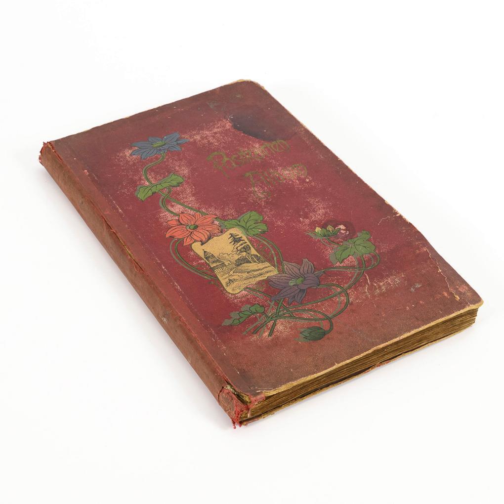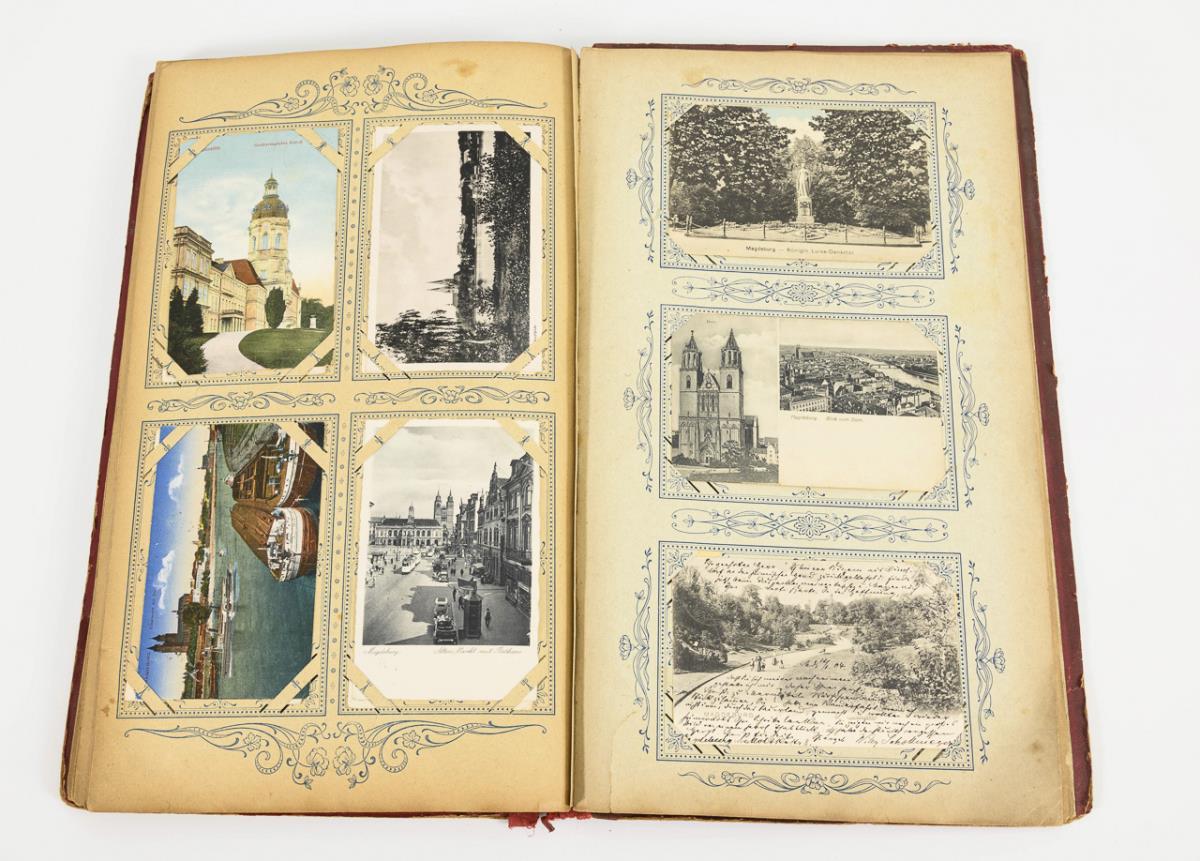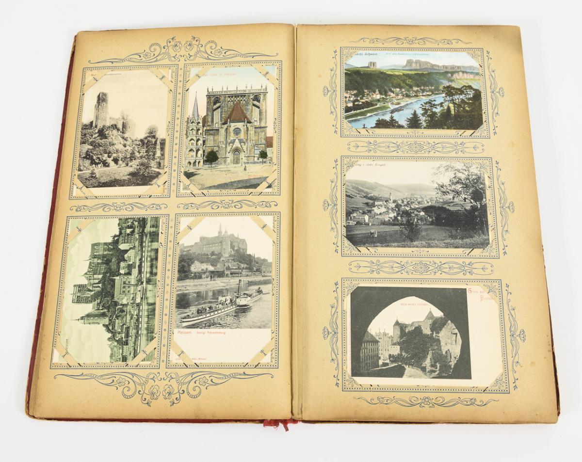 Approx. 240 postcards with views from the East of Germany, before 1945, in red "Postcard Album" with Art Nouveau flowers.