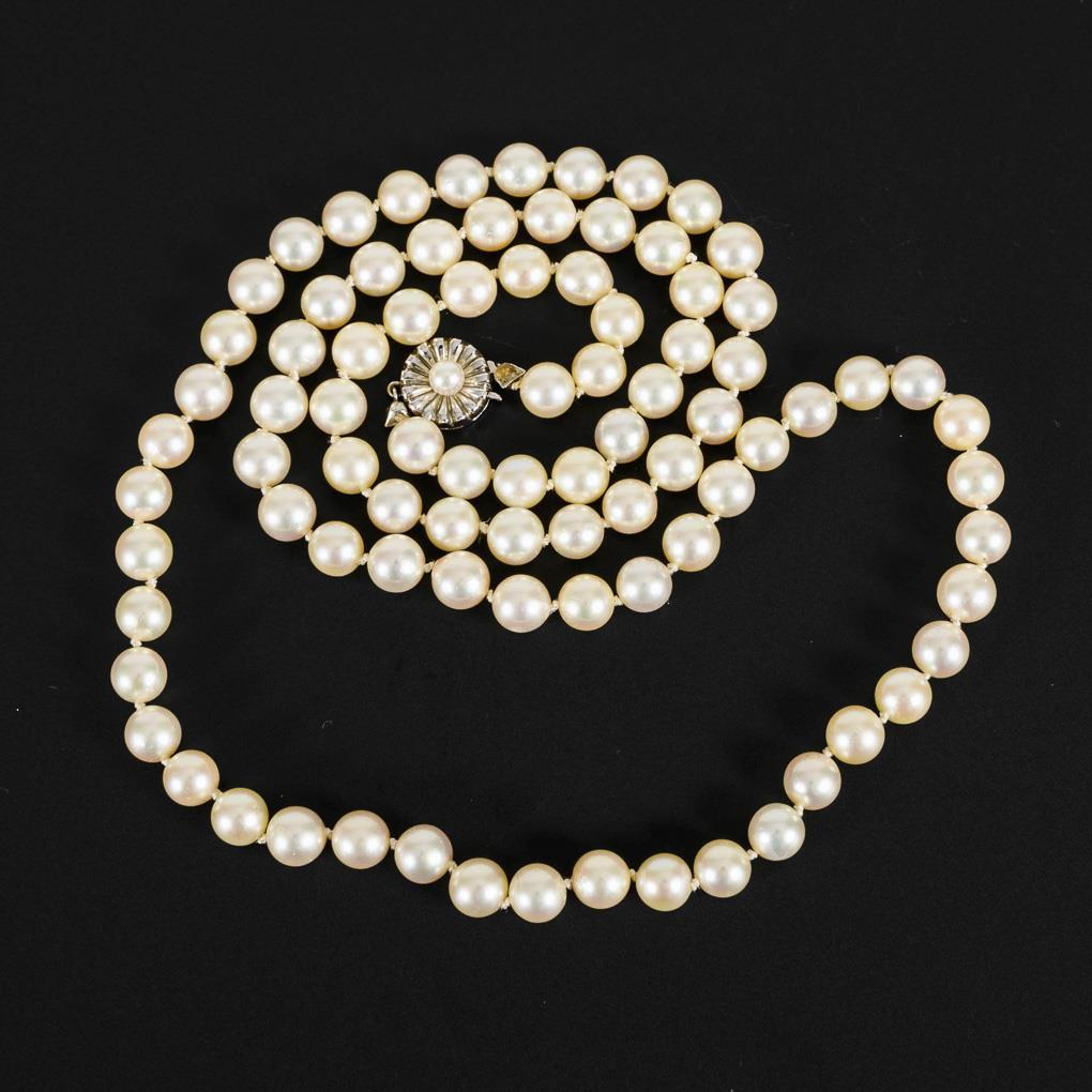 Yellow gold / white gold clasp 585 stamped. L 73 cm. Pearl Ø 7 mm. 47,5 g.