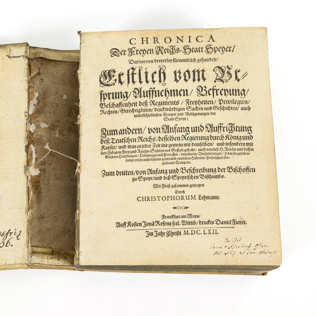 "Chronica der Freyen Reichs-Statt Speyer, Darinn von dreyerley fürnemblich gehandelt, Erstlich vom Ursprung, Auffnehmen, Befreyung, Beschaffenheit deß Regiment, Freyheiten, Privilegien, Rechten, Gerechtigkeiten, denckwürdigen Sachen und Geschichten auch unterschiedliche Kriegen und Belägerungen .."