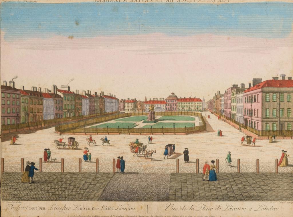 Guckkastenbild mit Ansicht des Leicester Squares in London: "Prospect von den Leicester Plaz in der Stadt London | Vue de la Place de Leicestre à Londres", "T. Bowles delin.", "B.F. Leizel sculp.". Stockfleckig, etwas verschmutzt.