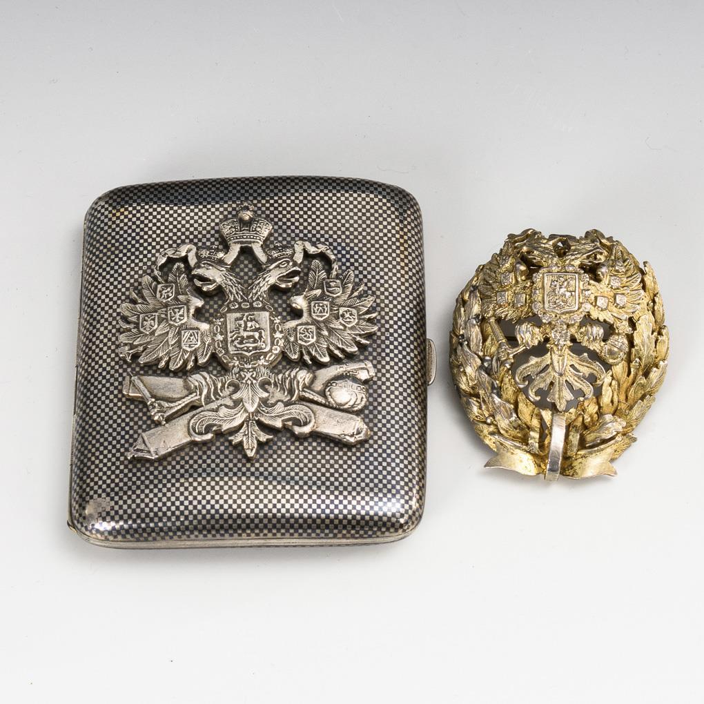 Elegant case with checkered pattern in niello technique and applied Russian double headed eagle. 900/master mark BC hallmarked. Gilt interior. 8,5 x 7,5 cm. / Remaining gilded silver brooch with double headed eagle. Unpunctured. 5.5 x 4.5 cm. Light signs of age, partially rubbed.