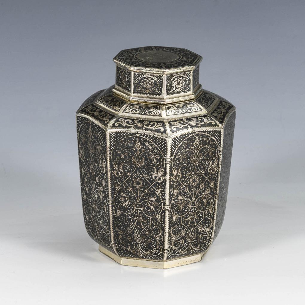 8-cornered body, richly decorated in niello technique. On the lid monogram engraving "ERS". Scarcely signs of use.
