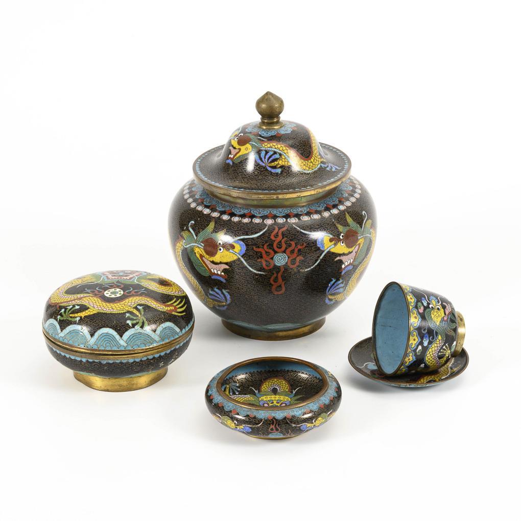 Lidded vase, box, kumm, ashtray and small plate. All with yellow dragon on black background and cloud pattern. Small plate with chipping on the bottom, box with small missing part on the dragon's horn and larger chipping inside and ashtray with small missing part on the rim. Cover vase in order.