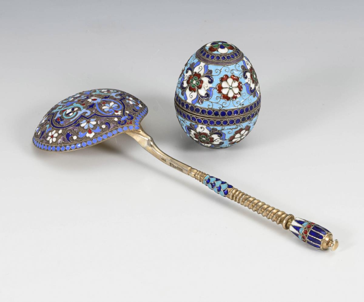 Both with colored enamel inlays. Spoon with gilded spoon.