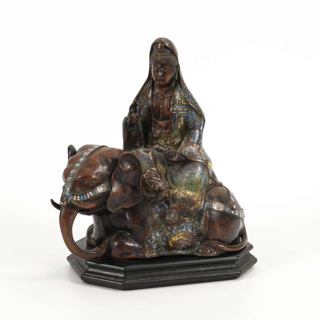 Sitting saint with scroll and mudra, on a reclining elephant. Loosely standing on octagonal wooden base. Enamel with small holes from the manufacturing process.