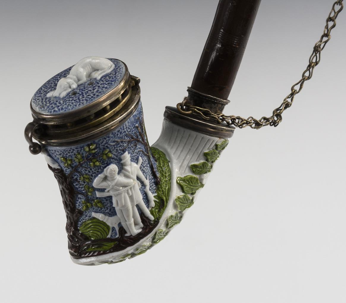 Painted in blue, green and brown. H pipe bowl 7.5 cm, L total 31.5 cm.