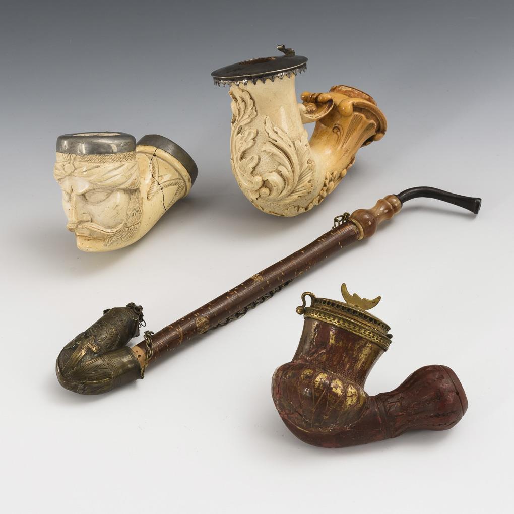 2x meerschaum, 1x red ceramic, metal mounts, 1x engraved brass fitting over red ceramic and sour cherry spar with horn. H head maximum 9.5 cm, L pipe 28 cm.